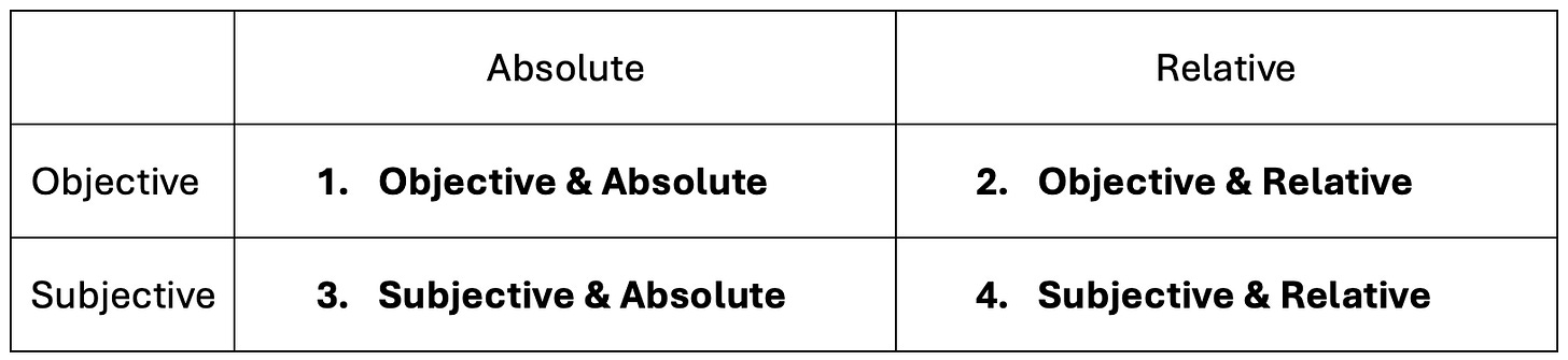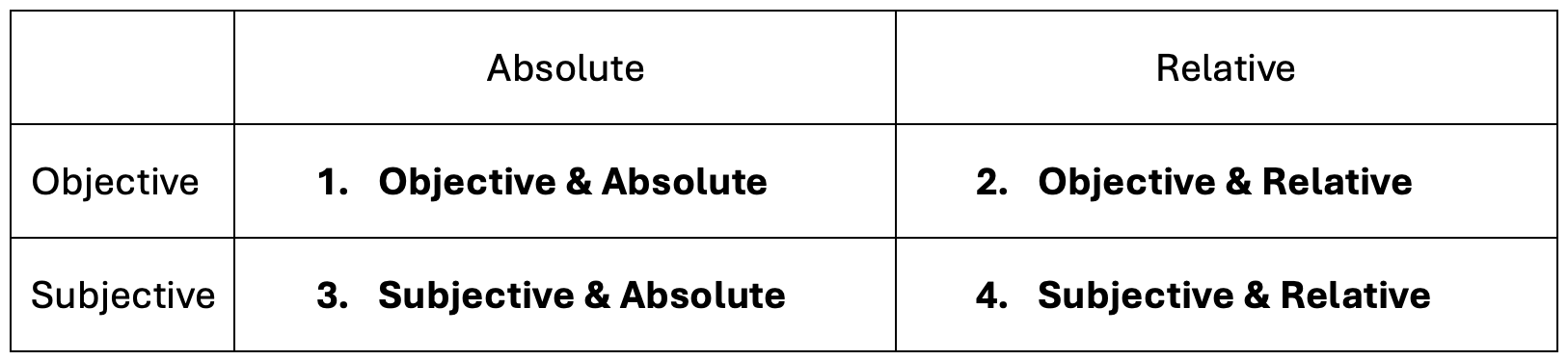 This is where I stand on determining something’s value. I usually don’t like being contained in any box, and I found myself in the same position while in my PhD. I don’t like that i need to decide on either being Objective or Subjective but rather that it can be a mix where you can bring the two together to understand the whole better. I align with this quadrant because even in the face of objective measures, people can ultimately consider that and still make a subjective call on determining value.